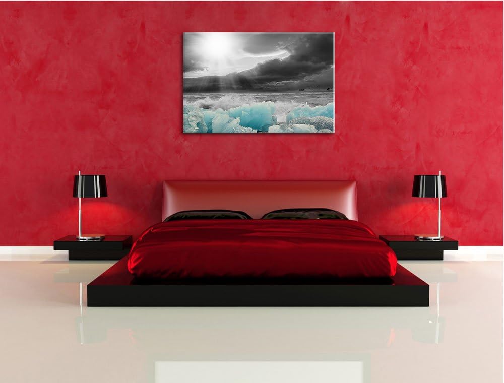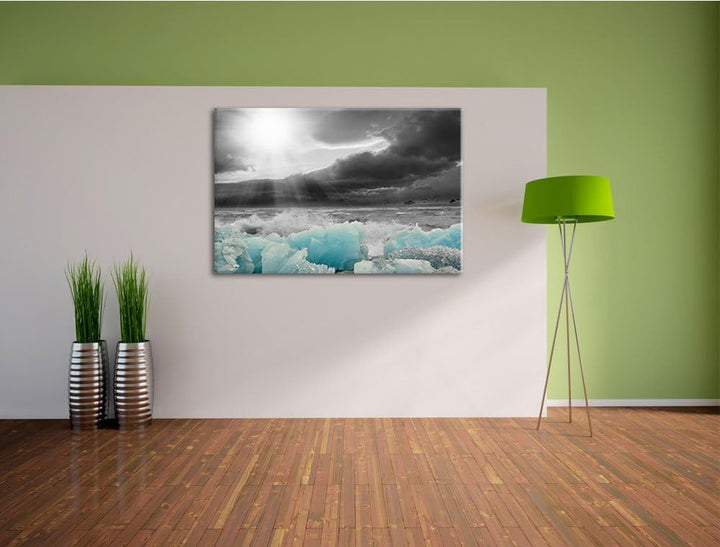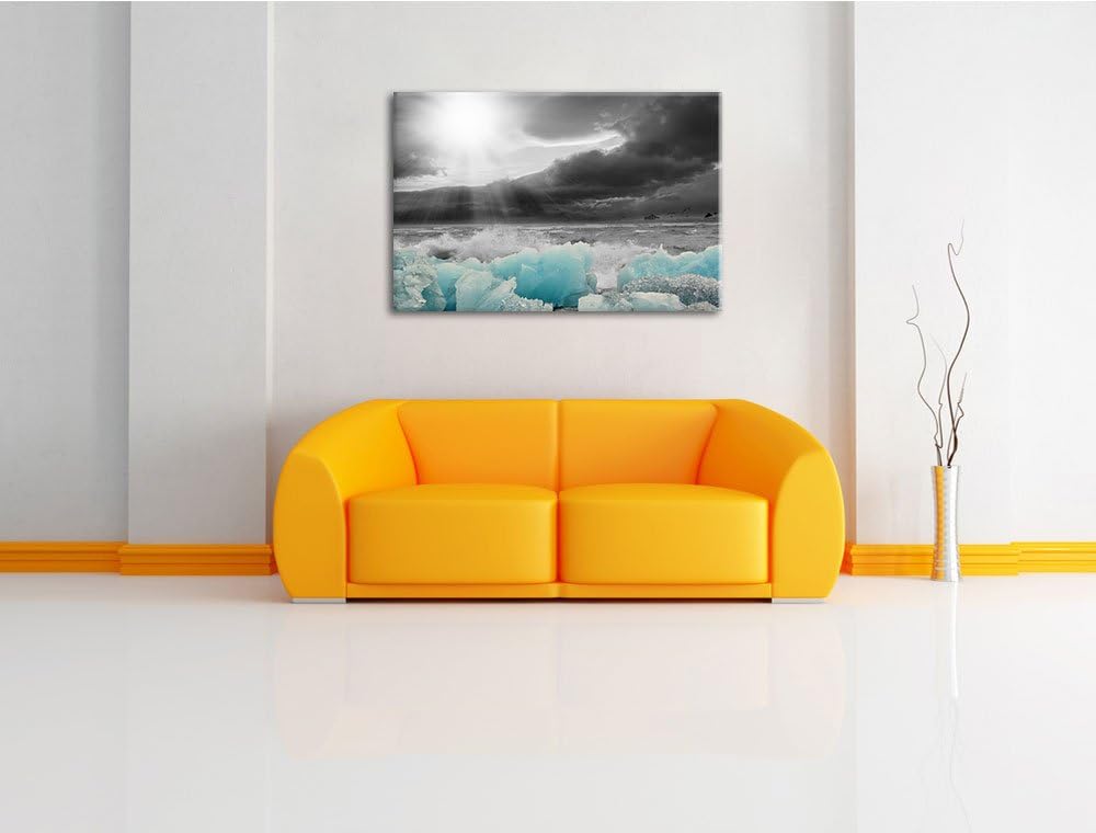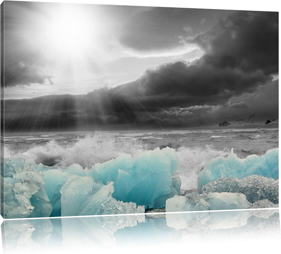 blaues Polareis an der Küste schwarz/weiss Format: 100x70 auf Leinwand, XXL riesige Bilder fertig ge