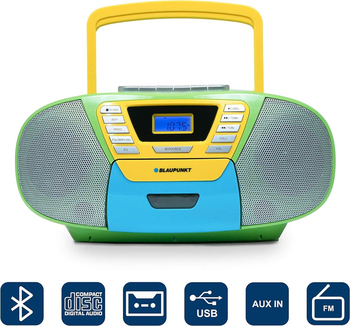 - MULTIFUNKTIONSTALENT: Der Bluetooth CD Player kommt mit Toploader Funktion und Kassetten-Spieler daher. Der tragbare CD Spieler ist mit einem AUX In Anschluss und einem USB Eingang ausgestattet, um ganz einfach externe Audioquellen anschliessen und
