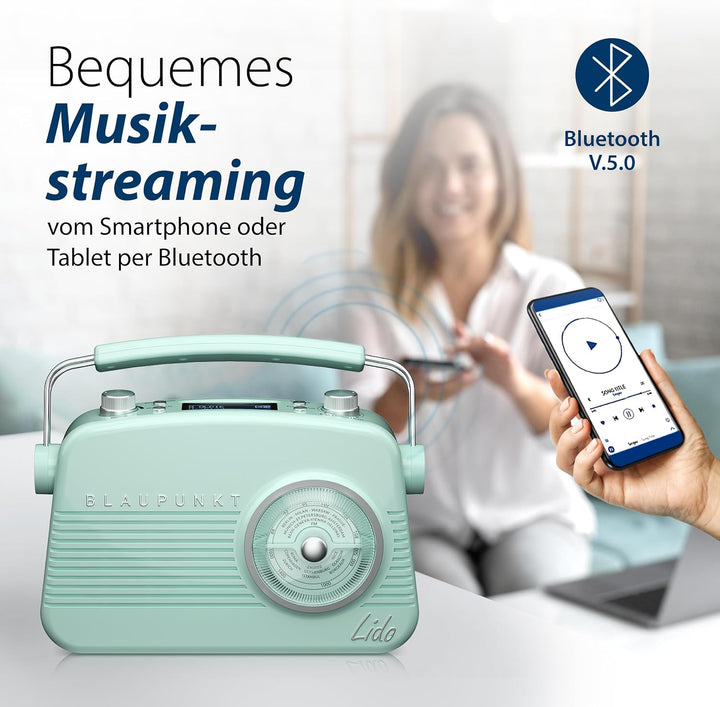 - Vielseitiger Musikgenuss: Das BLAUPUNKT LIDO kombiniert ästhetisches Retro-Design mit modernster Technologie. Geniessen Sie Ihre Lieblingsmusik auf vielfältige Weise – von Bluetooth 5.0 Musikstreaming über Mobilgeräte bis hin zum klaren Klang des