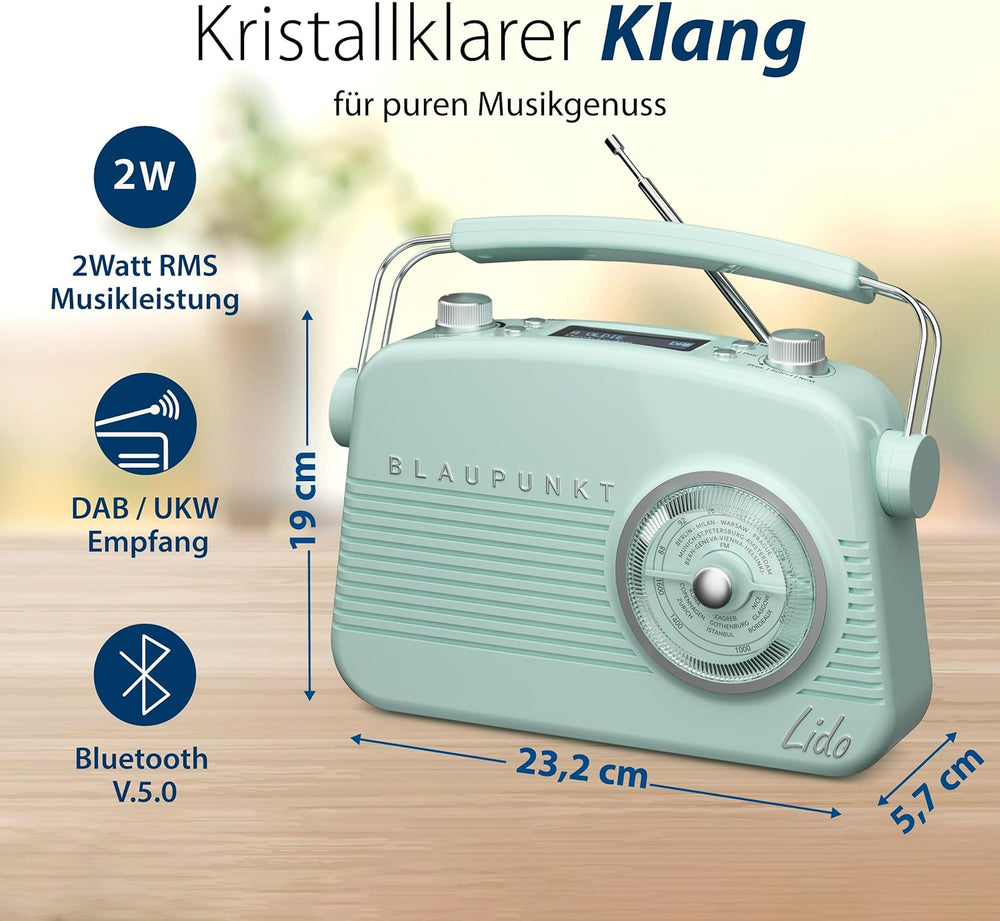 - Klangvolle Nostalgie: Tauchen Sie ein in die Vergangenheit mit dem BLAUPUNKT LIDO Nostalgieradio, das nicht nur äusserlich im Retro-Design erstrahlt, sondern auch mit klarem Klang und 2 Watt RMS Musikleistung überzeugt. Der Stereo Kopfhöreranschluss
