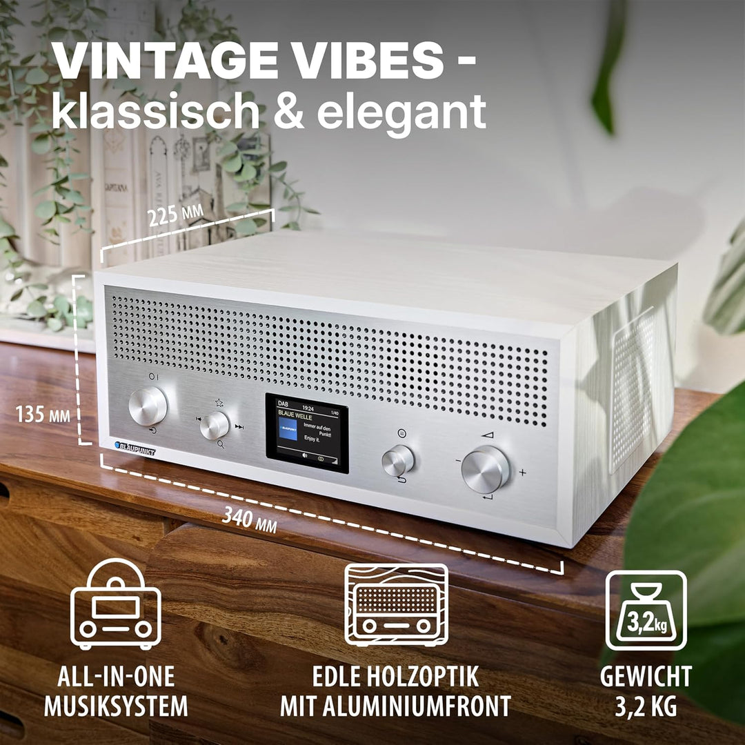 - ZEITLOSES DESIGN: Optisch überzeugt das Nostalgieradio mit einem edlen Klangkörper aus Holz kombiniert mit einer eleganten Aluminiumfront. Die einfachen Linien des minimalistischen und geschmackvollen Designs fügen sich ideal in jeden Raum ein.