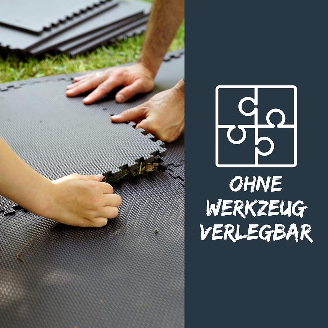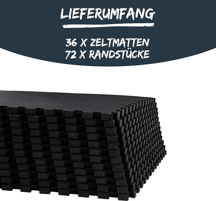 - DAS BEKOMMST DU - 36 x Zeltboden-Matten, Masse je Matte (ohne Randstücke): 38,5 x 38,5 x 1,0 cm, Masse je Matte (mit Randstücken): 41,5 x 41,5 x 1,0 cm, Material: EVA-Schaumstoff, Oberfläche: strukturierte Anti-Rutsch Oberfläche, Rückseite: glatt