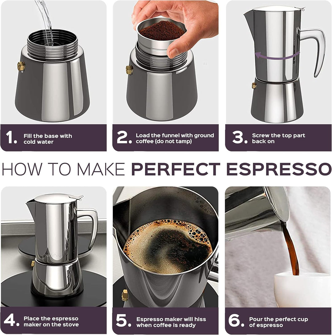 - SCHNELLER KAFFEEBEREITER: Wasserbehälter füllen, Espressopulver ins Sieb geben, kochen und geniessen!