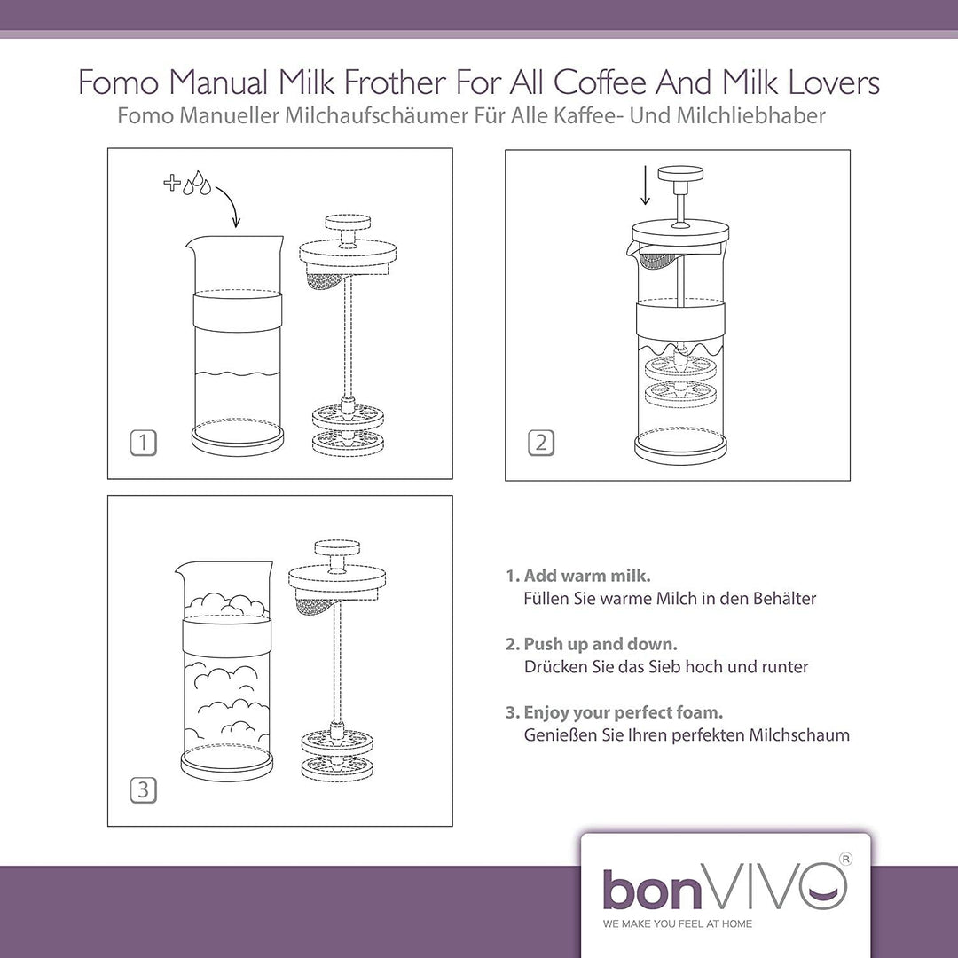 - ✔ QUALITÄT: Der bonVIVO Fomo ist ein manueller Milchaufschäumer mit einem Behälter aus geschmacksneutralem und hitzebeständigem Glas. Das Milchaufschäumer Glas ist umgeben von einem schwarzen Gummiband. Dieses sorgt für einen festen, sicheren