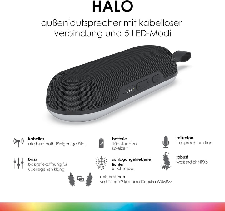- DYNAMISCHER SOUND & LICHT SHOW: Mit 5 faszinierenden LED-Lichtmodi ist der Halo mehr als nur ein Lautsprecher – es ist ein Erlebnis. Sehen Sie zu, wie die Lichter tanzen, synchronisieren und pulsieren im Takt Ihrer Lieblingstitel und verwandeln Sie