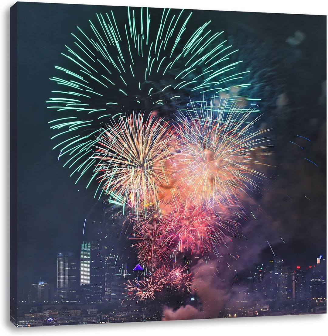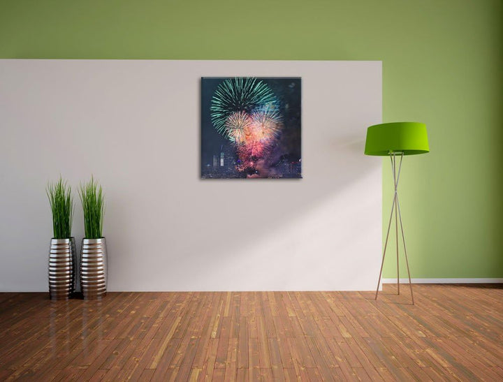 Boot auf See Feuerwerk, Format: 70x70 auf Leinwand, XXL riesige Bilder fertig gerahmt mit Keilrahmen