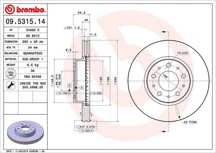 - Aussendurchmesser (mm) 280; Nenndicke (mm) 26; Mindestdicke (mm) 24