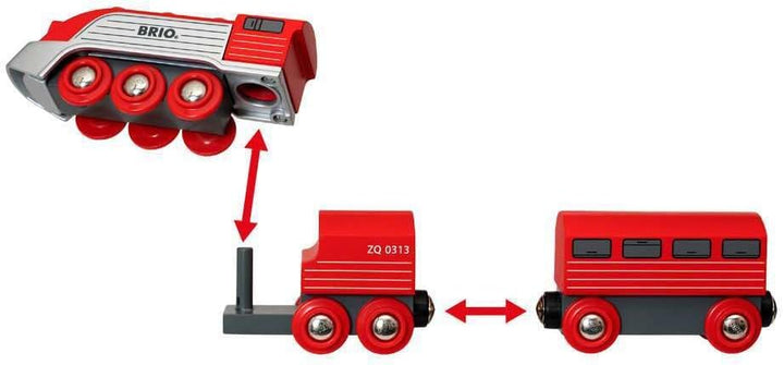 - Verbinde den Zug über Magnetverbindungen mit anderen Loks und Waggons, um deine BRIO Bahn wachsen zu lassen.
