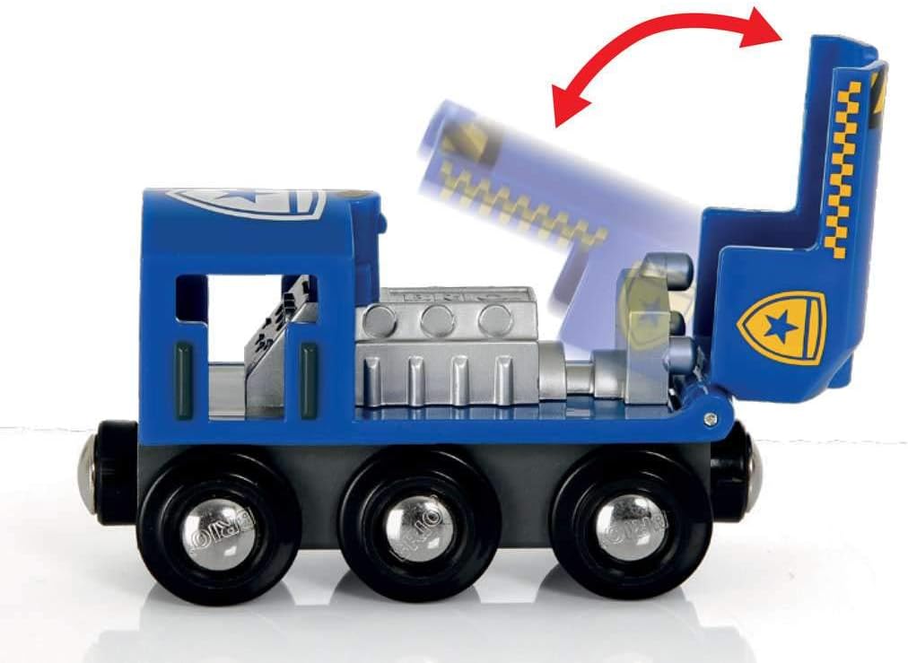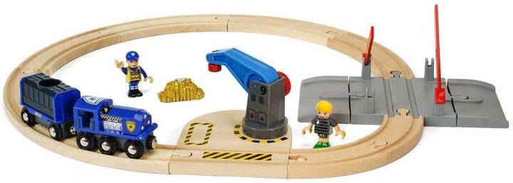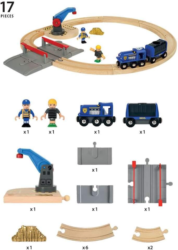 - Enthält eine Lok und einen Sicherheitswaggon, Magnetkran, Goldschatz, zwei Figuren und Holzschienen mit einem Bahnübergang. Der Waggon lässt sich nur mit Hilfe des Magneten öffnen.