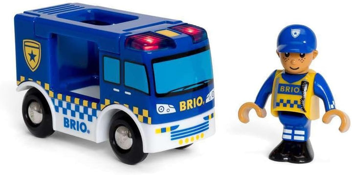 - Produkt 1: Polizeiwagen mit Licht- und Geräuscheffekten und einem Dach, das sich öffnen lässt, sowie Platz für einen Polizisten