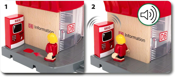 - Erstes offizielles Deutsche Bahn-Spielset von BRIO mit grossem ICE, Bahnhof mit Ticket-Automat und DB Info-Schalter, Bahnübergang, Bus und tollem Zubehör