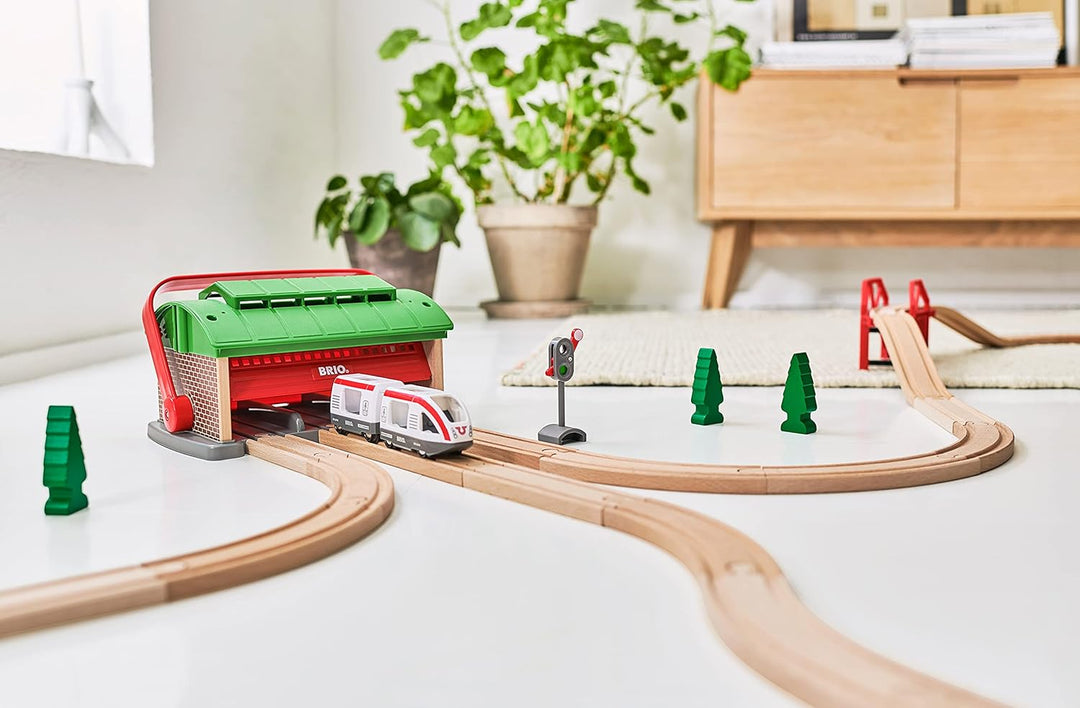 - Mit den drei separaten Schienenverbindungen kannst du den Lokschuppen mit deiner BRIO Bahn verbinden.