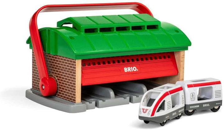 - Lokschuppen mit Platz für drei Spielzeugloks, einem grossen Griff mit Doppelfunktion und BRIO World Reiselok mit Waggon.
