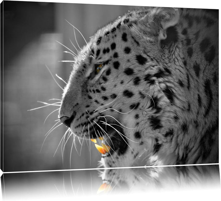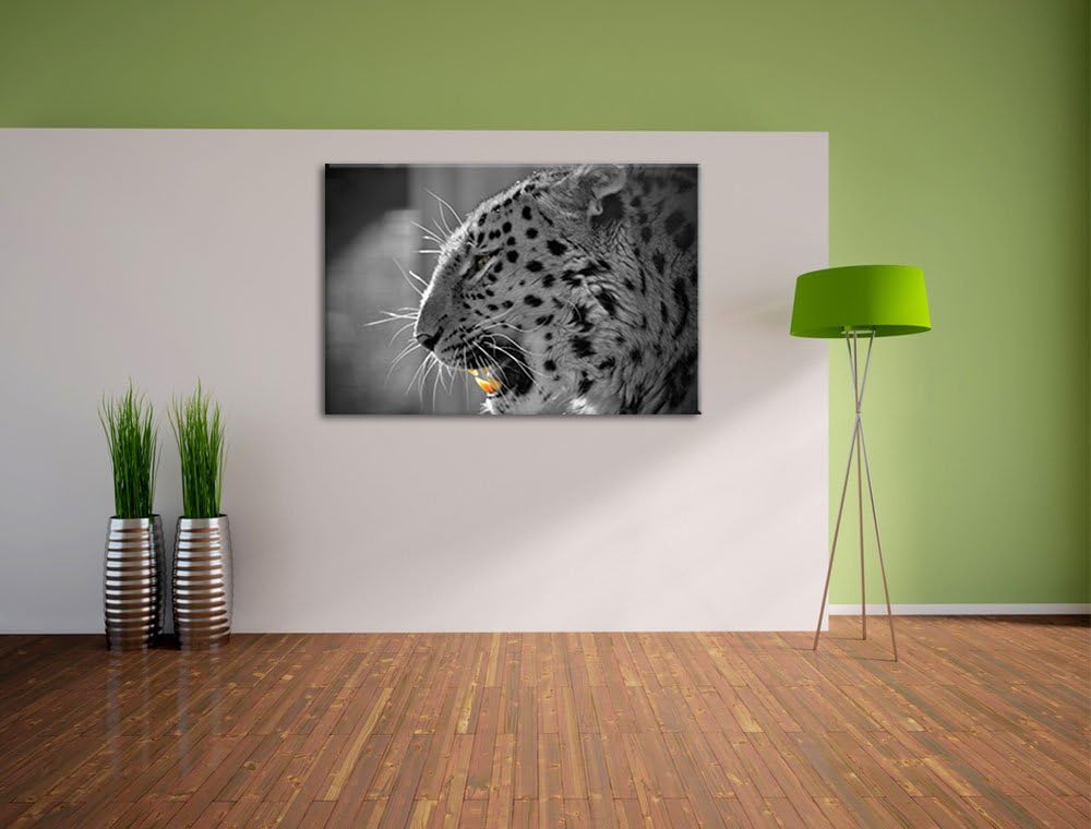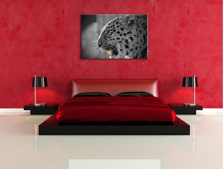 brüllender Leopard schwarz/weiss auf Leinwand, XXL riesige Bilder fertig gerahmt mit Keilrahmen, Kun