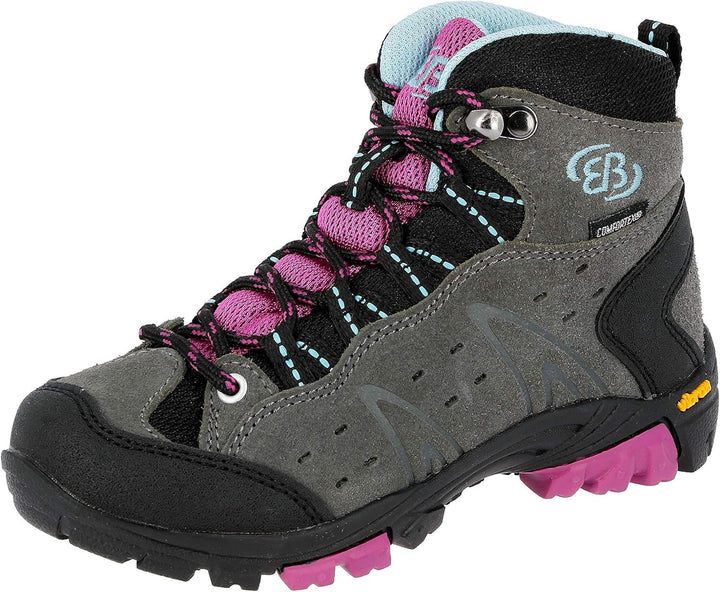 PRODUKTBESCHREIBUNGEN -Obermaterial: Veloursleder mit Nylon-Einsätzen -wasserdichte und atmungsaktive Comfortex-Klimamembrane -angenehme Schaft- und Laschenpolsterung -antiallergisches Textilfutter - auswechselbare Textileinlegesohle -stabile und rutschfeste Vibram-Laufsohle -Verschlussart: Schnürer mit abschlusshaken -geschlecht: Mädchen -Farbtöne: grau/lila/blau für die nächsten Entdeckungstouren gerüstet. Als Obermaterial kommt ein Materialmix aus hochwertigem Velourleder und Nylon-Einsätzen zum Einsatz. Das gepolsterte Textilfutter und die herausnehmbare Textileinlegesohle geben ein angenehmes Tragegefühl. Dazu die wasserdichte und atmungsaktive Comfortex-Klimamembrane für trockene Füsse von aussen und von innen. Abgerundet wird der Outdoor Stiefel Mount bona high von brütting durch die robuste Vibram-Sohle, die sicheren und festen Halt gibt.