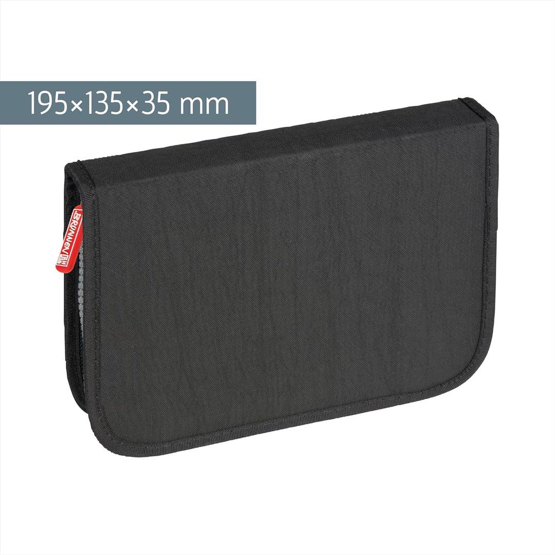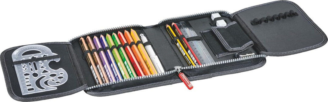 - Neun dicke Markenbuntstifte, Zwei Markenbleistifte, Lineal 16 cm, Metalldoppelspitzer, Radiergummi, Geldfach mit Klettverschluss, Stundenplan, Zeichenschablone