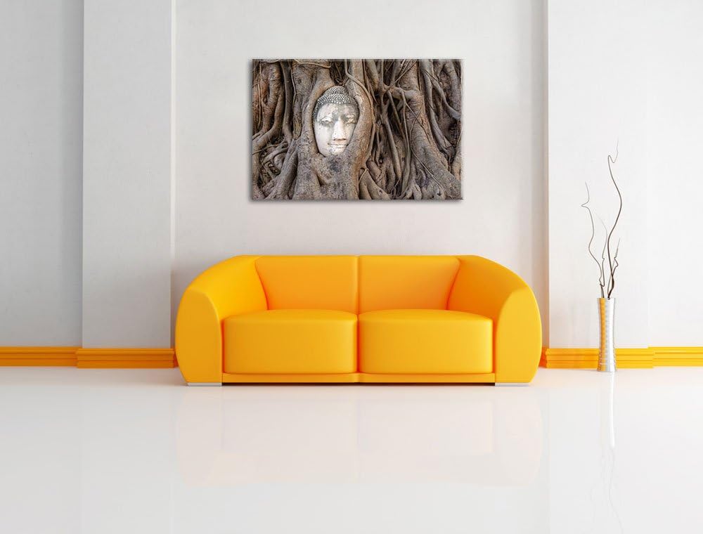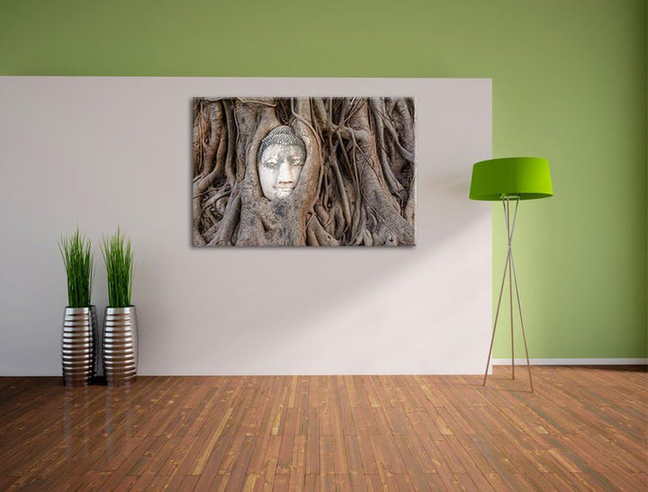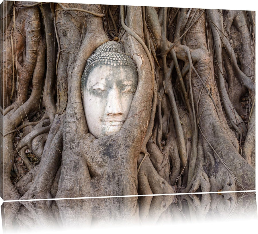 Buddha Kopf verwachsen im Baum Format: 100x70 auf Leinwand, XXL riesige Bilder fertig gerahmt mit Ke
