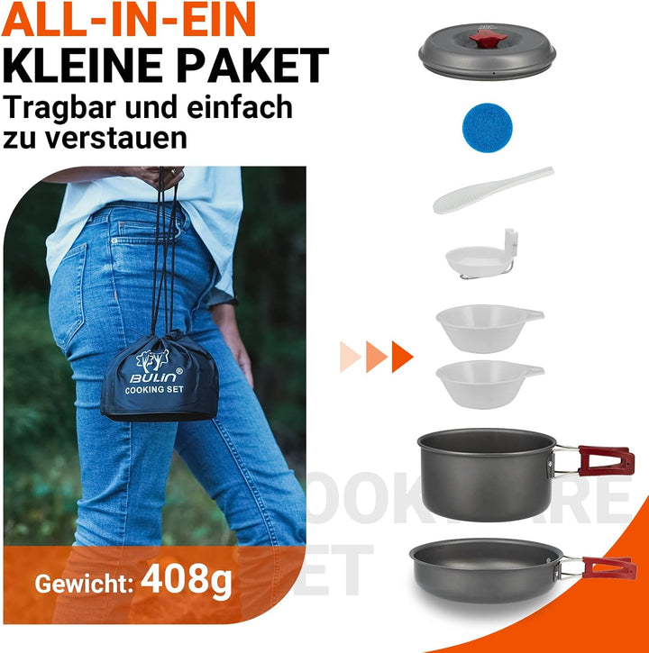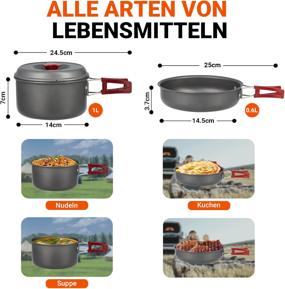 - Dieses grossartige Kochgeschirr-Set ist für alle gedacht, die Outdoor-Camping mit Familien und Freunden lieben! Es ist super tragbar und macht es viel bequemer für Camping, Wandern, Backpacking, Picknick und andere Outdoor-Aktivitäten!