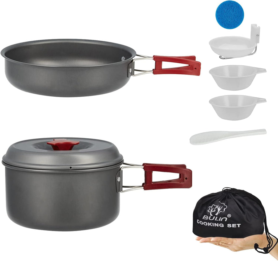 - Ideal für 1–2 Personen: Das Camping Kochset beinhaltet 1 Topf mit Deckel, 1 Pfanne, 1 faltbare Reislöffel, 1 kleine Löffel, 2 Schale, 1 Stück Reinigungsschwamm und 1 Tragtasche. Sie können die Kochbedürfnisse von 1-2 Personen vollständig