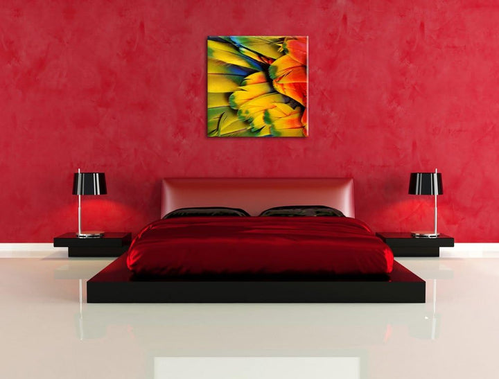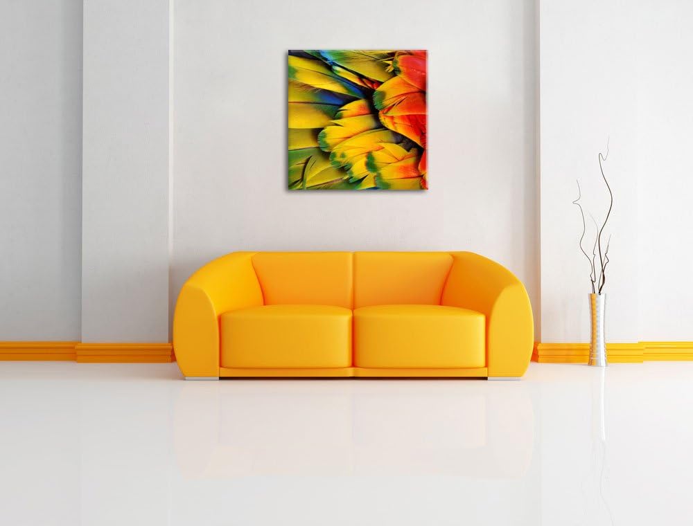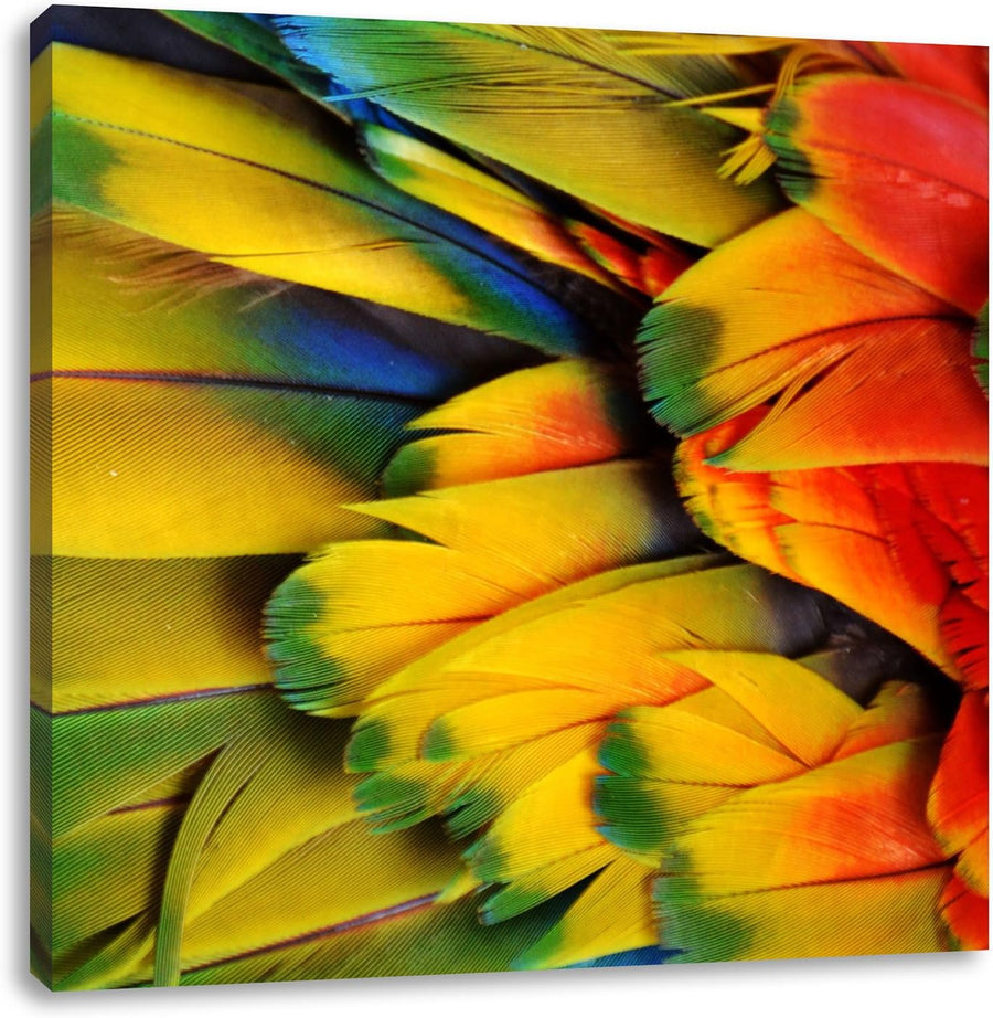 Bunte Papageienfedern, Format: 70x70 auf Leinwand, XXL riesige Bilder fertig gerahmt mit Keilrahmen,