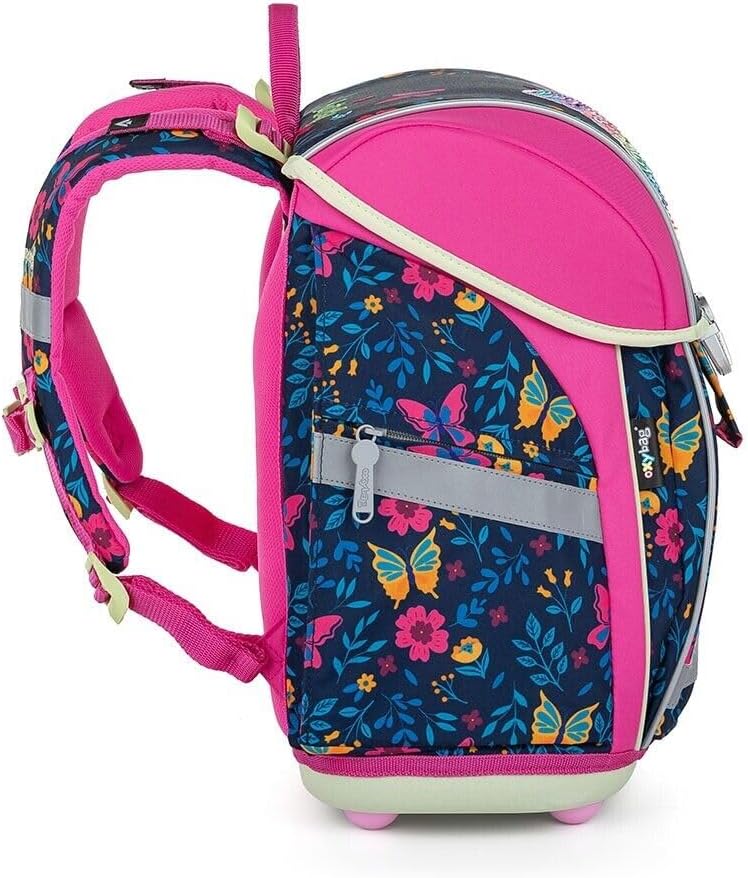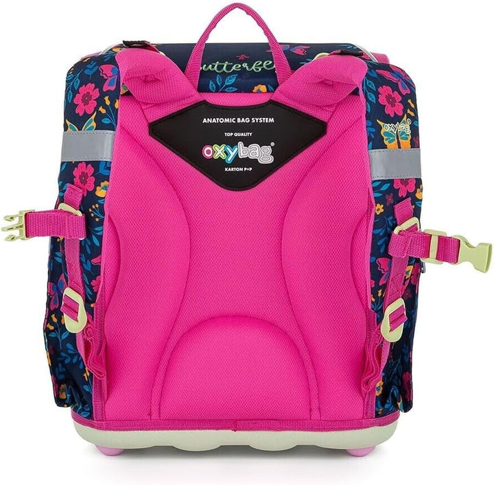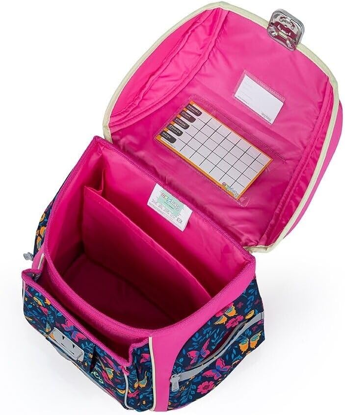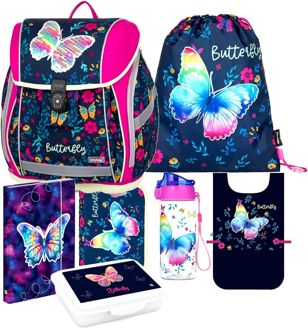 PRODUKTBESCHREIBUNGEN " Butterfly " 10 teiliges SCHULRANZEN-SET bestehend aus : SCHULRANZEN + FEDERMAPPE + MALSCHÜRZE + TURNBEUTEL + A4 HEFTBOX + SCHULTÜTE + SCHREIBTISCHUNTERLAGE + GELDBÖRSE + BROTDOSE + TRINKFLASCHE -- SCHULRANZEN: super leicht ca. 1000 Gramm Hauptfach mit Unterteilung für Hefte und Bücher Hauptfach mit KLICK Verschluss 1 Vordertasche mit Reissverschluss 2 Seitentasche mit Reissverschluss mit Reflektoren Tragegriff gepolsterte, verstellbare Trageriemen ein ergonomisch geformtes und atmungsaktives Rückenpolster dazu ein stützendes Polster speziell im Lendenwirbelbereich mit stabilem, stossfestem Boden wasserabweisendes Material Material: 100% Polyester Aussenmass LxBxH ca.: 30 x 20 x 37 cm + " BUTTERFLY " FEDERMAPPE + TURNBEUTEL ca. 40 X 30 CM GROSS + Butterfly A4 HEFTBOX aus harter Pappe + GELDBÖRSE + BROTDOSE + SCHULTÜTE + SCHREIBTISCHUNTERLAGE + MALSCHÜRZE + TRINKFLASCHE