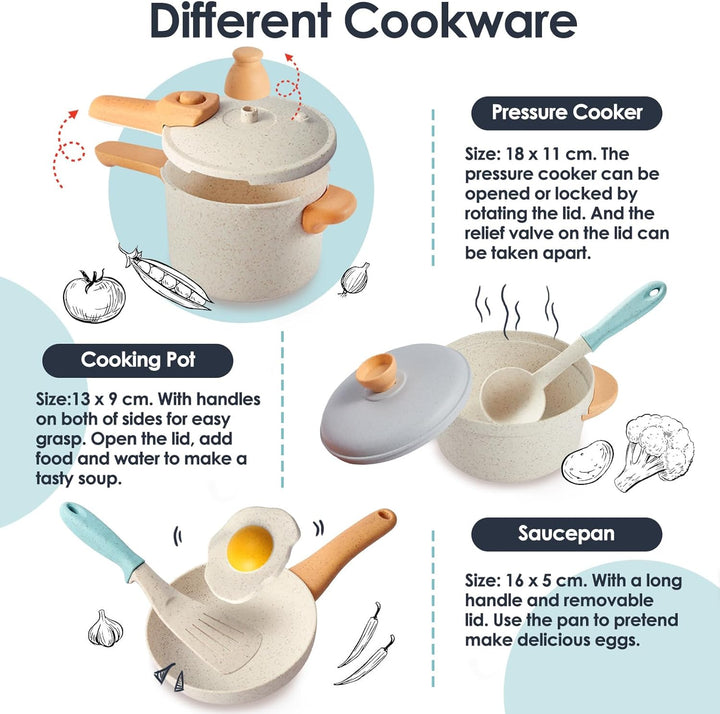 - 【Realistisches Spielküche Zubehör】- Unser kinderpielzeug hat ein realistisches Design. Alle Deckel können geöffnet werden, und der Schnellkochtopf kann auch durch Drehen des Deckels geöffnet oder geschlossen werden. Das hohe Simulationsdesign
