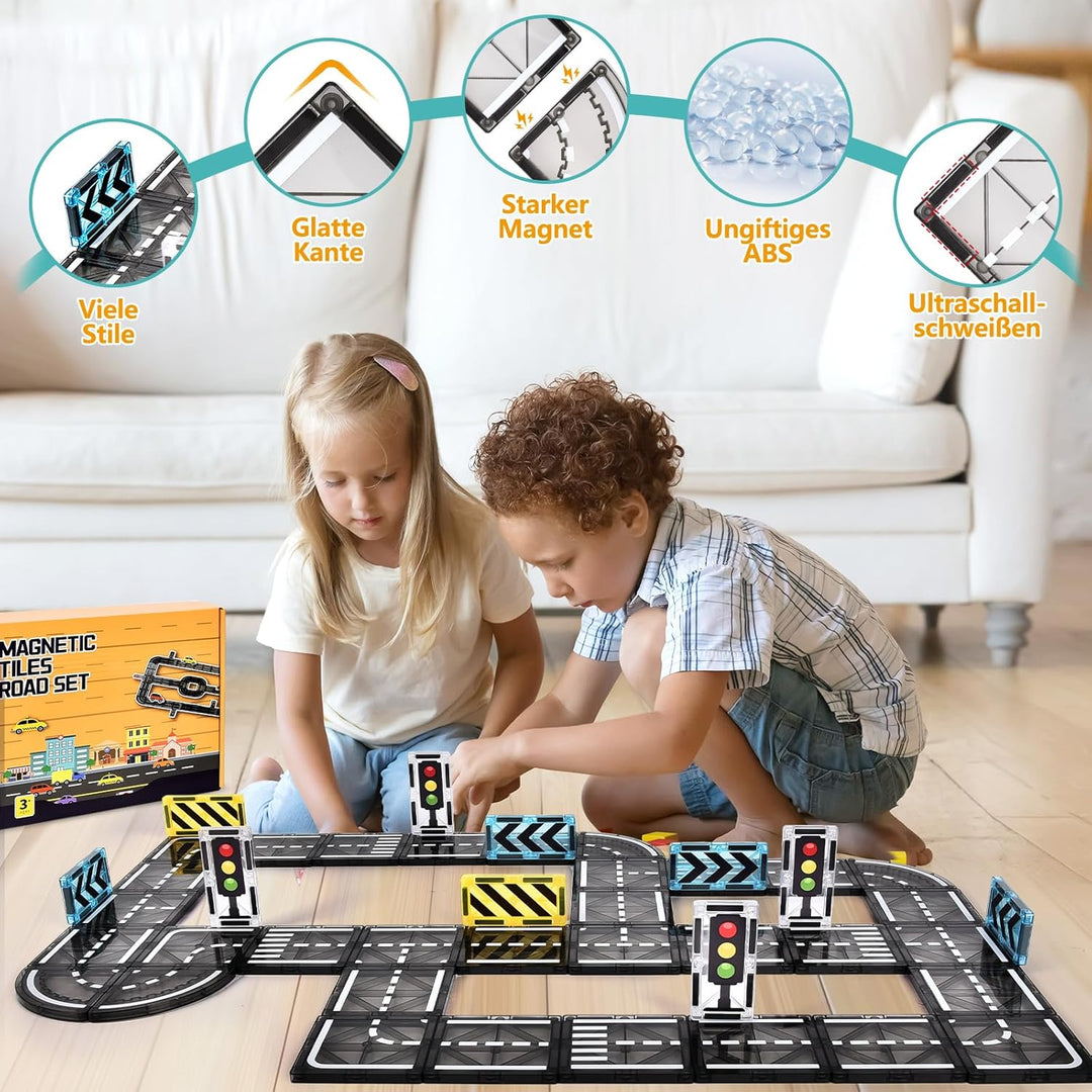 BuzzoXerex Magnetische Bausteine Strassenset, 50PCS Magnetische Fliesen Stadtstrassen, Magnetbaustei
