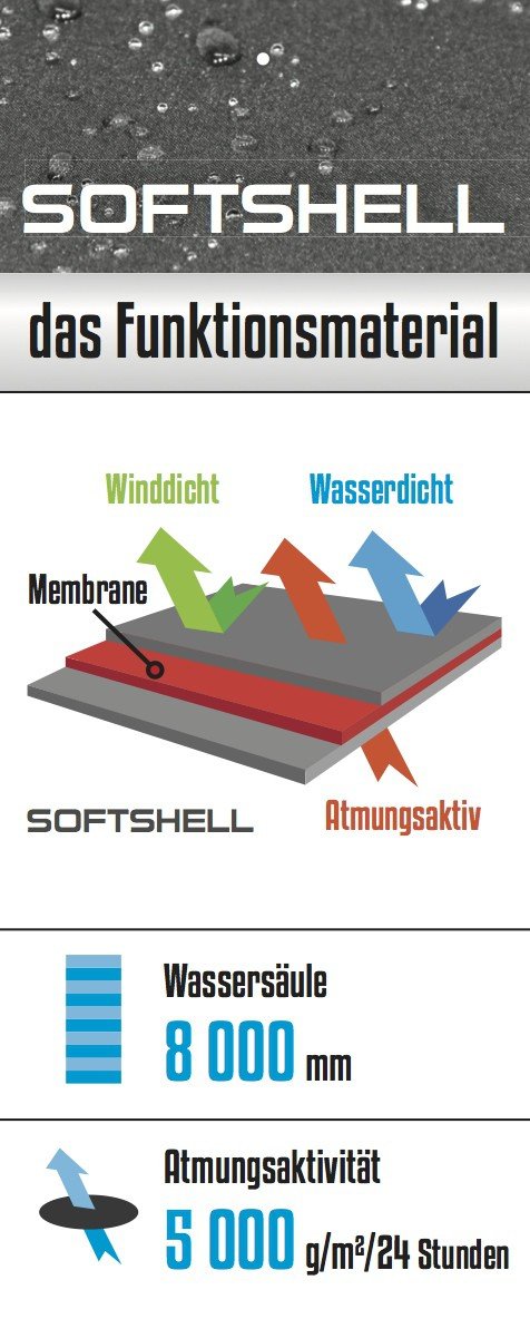 - Aussenmaterial Softshell (wasser- und windabweisend); Innenmaterial Thermo-Polarfleece (weich und wärmend)