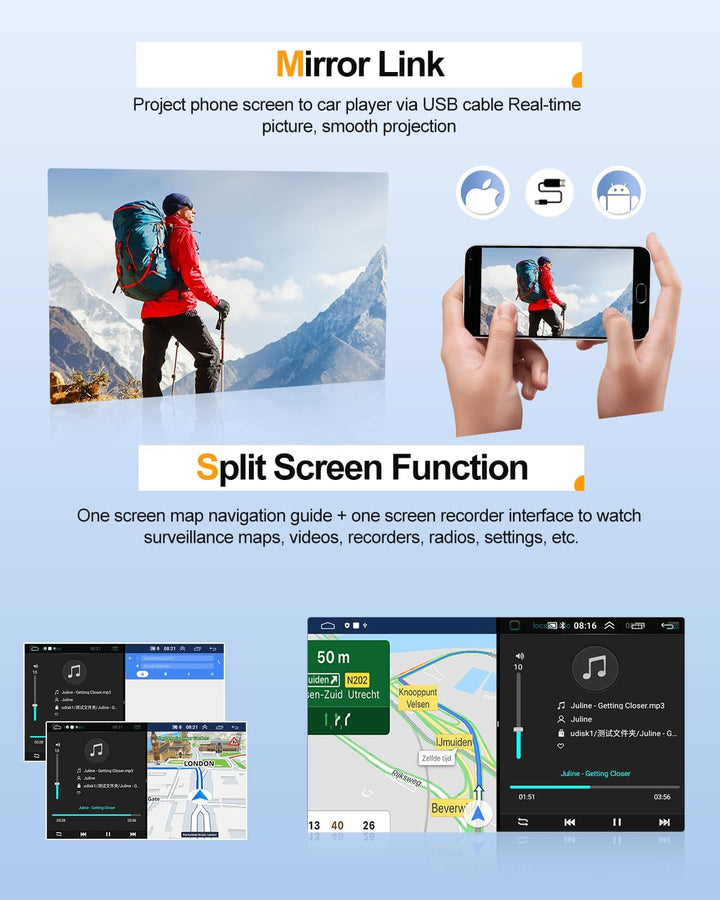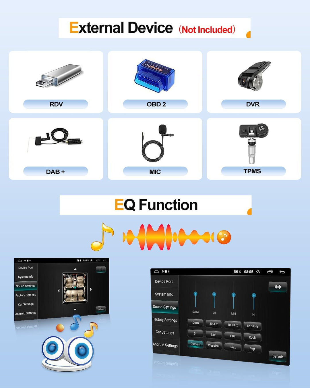 - đăOptional Functionă â UnterstĂŒtzt Split-Screen-Funktion, kann mehrere Anwendungsseiten gleichzeitig anzeigen, geniessen Sie den Spass der Multi-Funktions-Zusammenarbeit wie Navigation, Musikwiedergabe. UnterstĂŒtzt externe DVR, OBD2, DAB+,