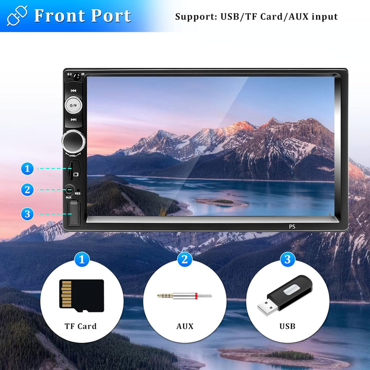 - 🎉【Produktspezifikationen】Grösse des Radios: 178*102*64mm, passend für die meisten doppel-din-autoradios. Autoradio mit 7"-Bildschirm, zwei USB-Anschlüsse (einer vorne und einer hinten) mit AUX-in/SD-Kartenanschluss. Unterstützt Audioeingang und -ausgang, Videoeingang und -ausgang. Unterstützt den Subwoofer-Audioausgang und den Mikrofoneingang.