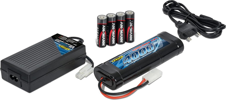 - Zusätzliche Akkus und Batterien: Das Lade-Set beinhaltet einen 6-zelligen 7,2 V NiMH-Akku mit einer Kapazität von 4000 mAh sowie 4 AA-Batterien mit einer Spannung von 1,5 V für den Einsatz in Sendern oder anderen Geräten