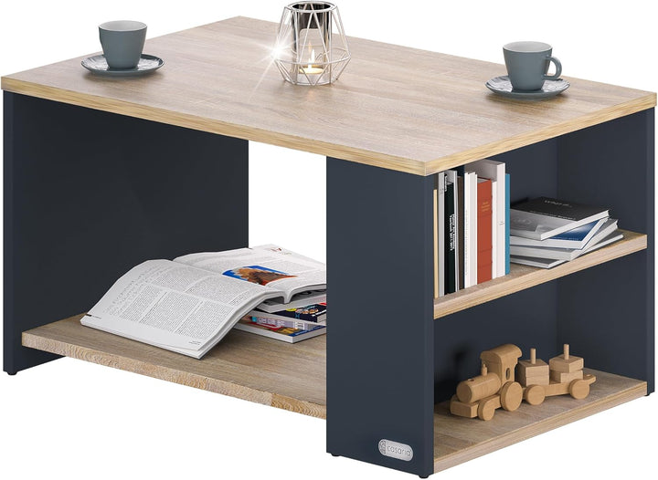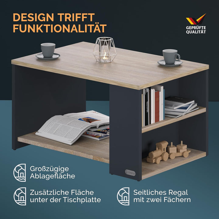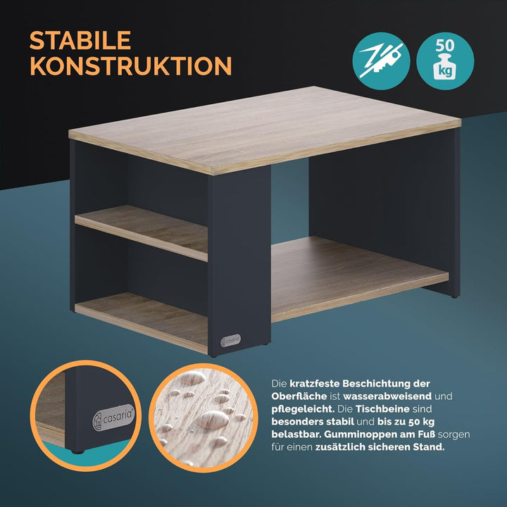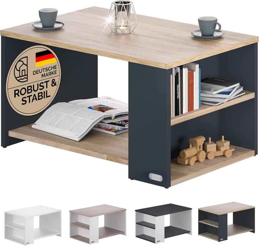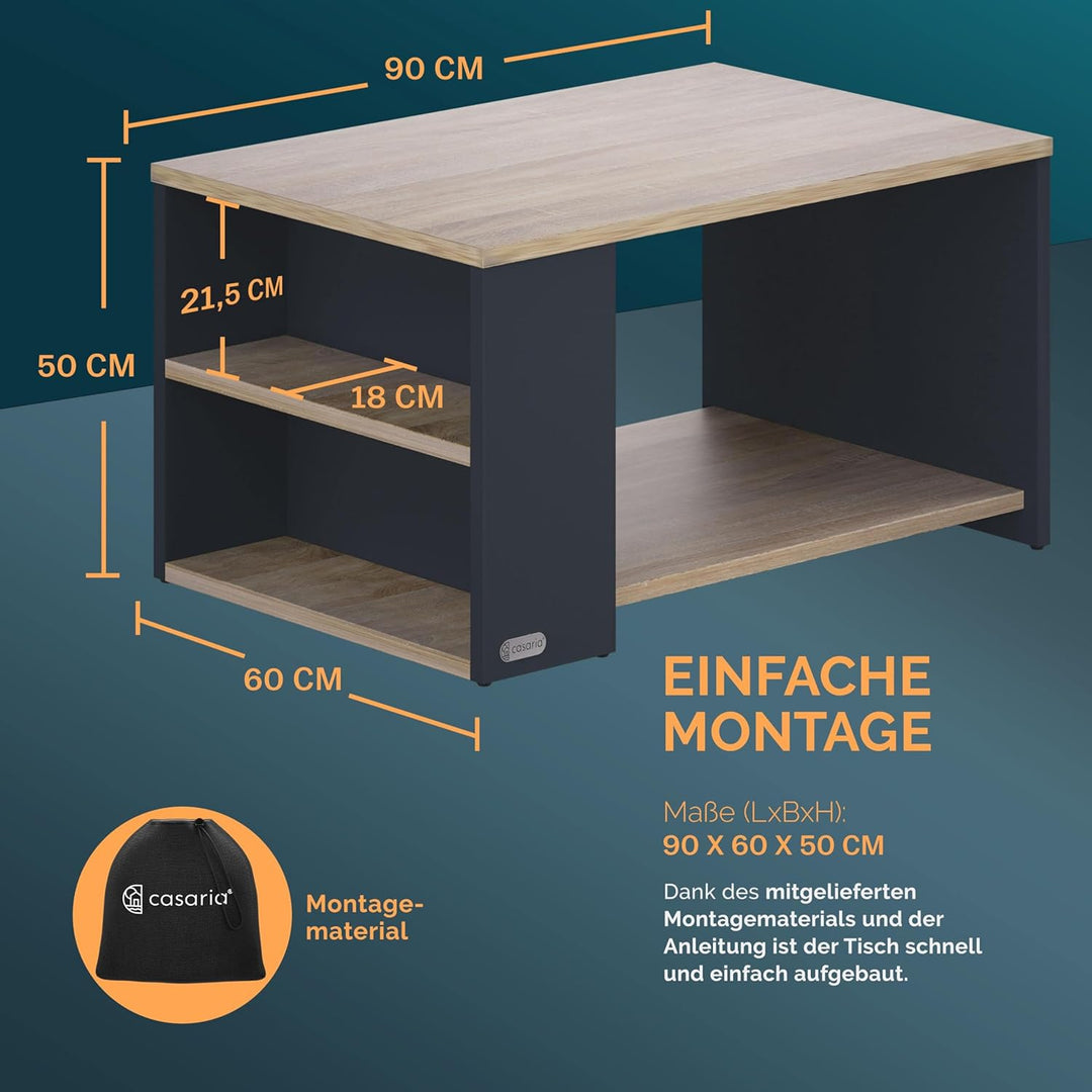 - VIEL STAURAUM - Der CASARIA Couchtisch Santa Cruz bietet dank der 90x59cm grossen Tischplatte, einem Regal mit 2 Fächern (60x22cm) an der Seite sowie einer unteren Ablage, viel Platz für deine Fernbedienung, Bücher, Getränke, Snacks und vieles mehr.