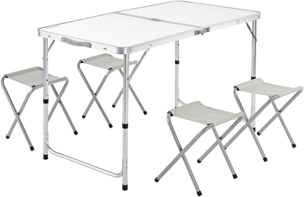 - PRAKTISCH - In der Mitte des Tisches befindet sich ein 3cm grosses Schirmloch für Sonnenschirme. Die 4 Camping Hocker lassen sich im Tisch verstauen und sind immer griffbereit. Das Möbel Set passt nahezu in jedes Auto oder Camper.