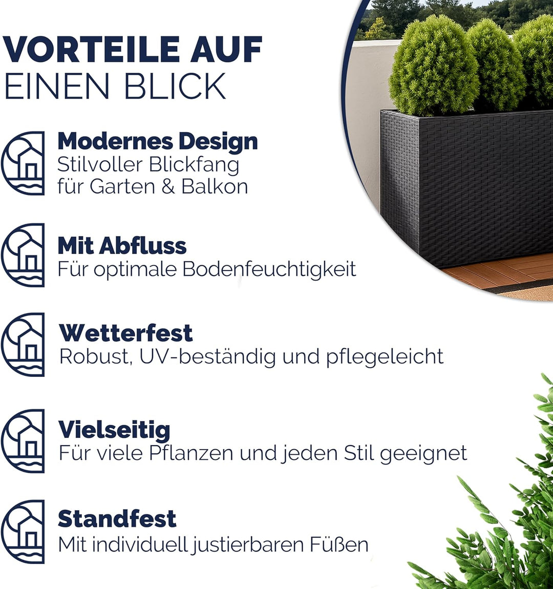 • PRAKTISCH - Die Innentöpfe lassen sich problemlos aus dem Polyrattangestell des Blumenkastens herausnehmen. Ausserdem besitzen sie jeweils einen wiederverschliessbaren Wasserabfluss, welche zur Vermeidung von Staunässe dienen.