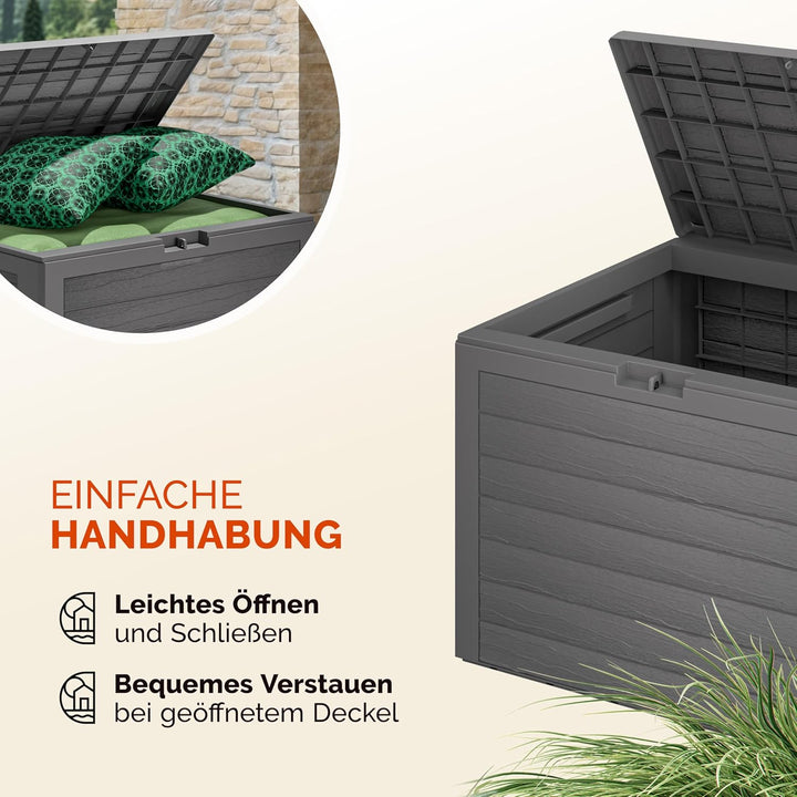 - WETTERFEST & PFLEGELEICHT: Die hochwertige Kissenbox ist sehr wetterfest und UV-beständig, schützt somit deine Auflagen bestens vor Wind und Wetter. Durch das langlebige, wetterbeständige Material ist die Truhe besonders pflegeleicht und sehr gut für