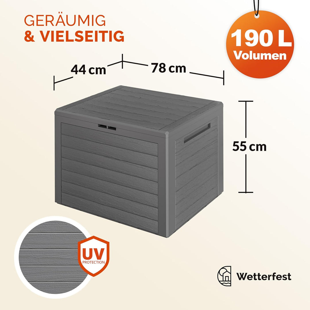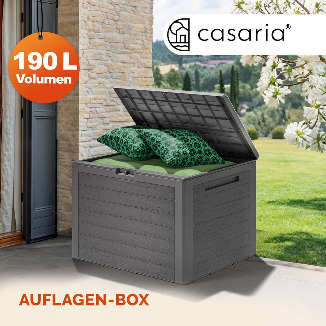 - QUALITÄT: Mit der Gartenbox Lille von CASARIA, aus hochwertigem Polypropylen Kunststoff, hast du die perfekte Lösung für deinen Balkon, die Terrasse oder den Garten. Dank einem Fassungsvermögen von 190L, bietet sie genügend Platz für deine