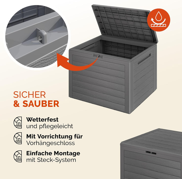 - EINFACHE MONTAGE: Das simple Klick-System ermöglicht eine schnelle Montage der Gartenbox - ganz ohne Werkzeug! Die einzelnen Teile können ganz einfach und komplikationslos, zusammengesteckt werden. Deine neue Aufbewahrungstruhe wird dein optimaler