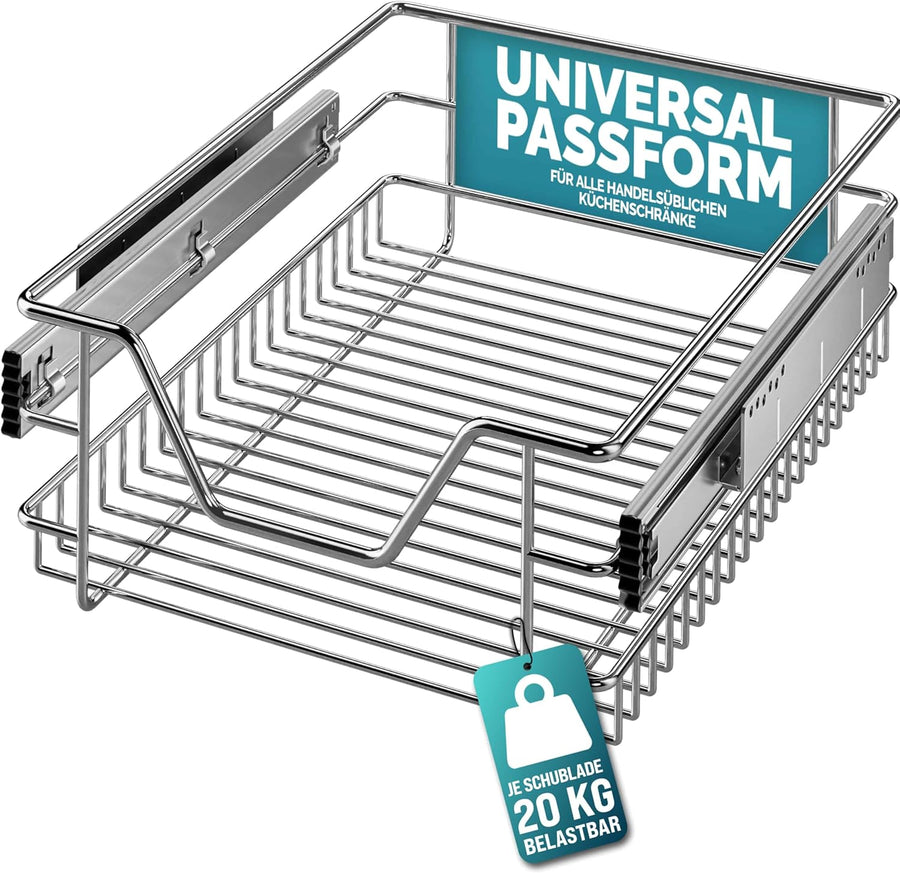 - 25 KG BELASTBAR: Damit Sie sorgenlos Ihre Sachen verstauen können, ist die Schublade bis 25 kg belastbar und ist somit besonders stabil und robust. Der Korbauszug besteht dabei aus verchromten Metall mit verzinkten Führungsschienen. Für eine direkte Montage sind 6 Schrauben im Lieferumfang enthalten.
