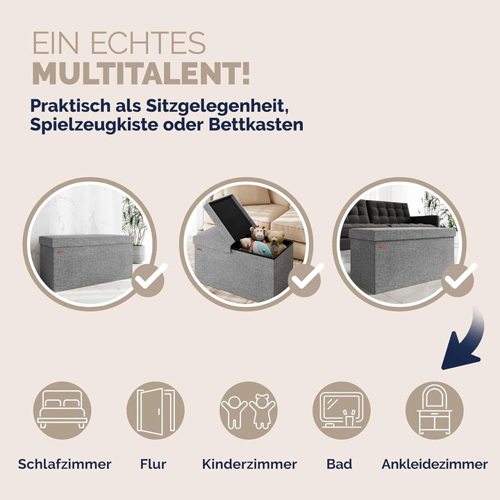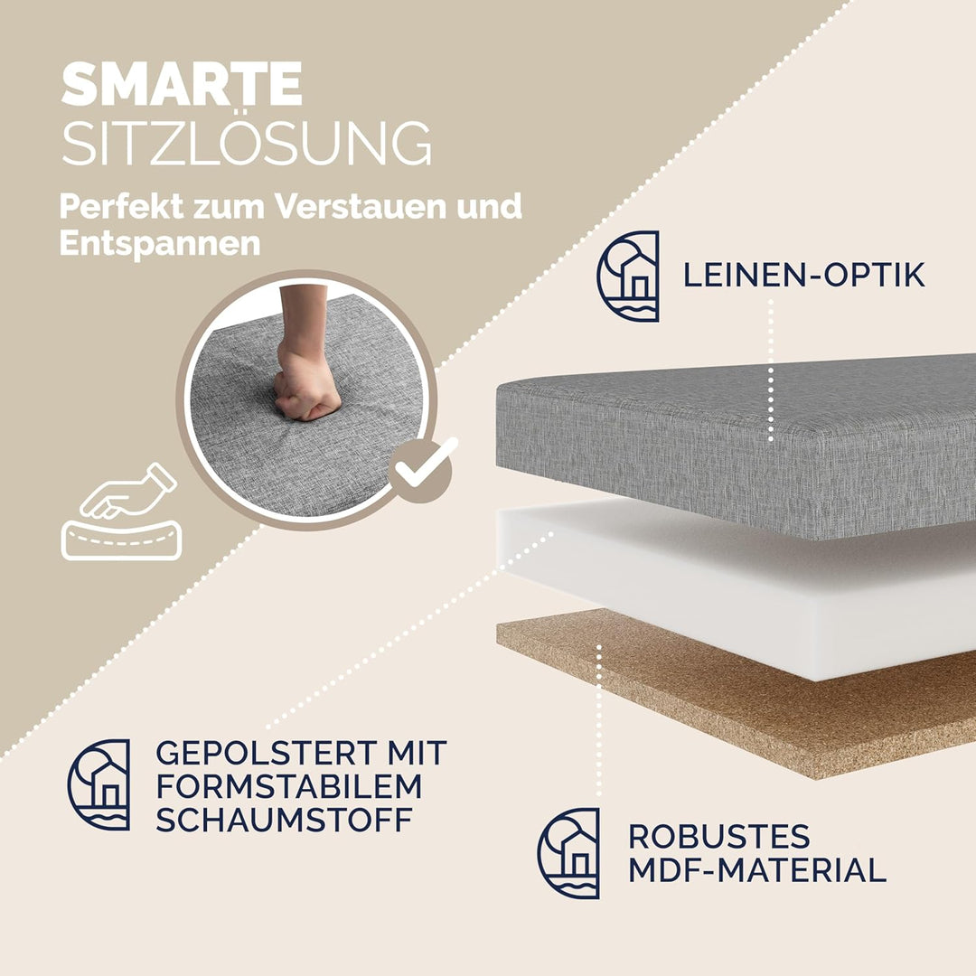 - KLAPPBARER DECKEL: Die moderne Sitzbank mit Stauraum, in Leinen-Optik von CASARIA, wird dich begeistern. Dank des zeitlosen Stils passt die Truhenbank hervorragend in jeden Wohnbereich, egal ob Schlafzimmer oder im Flur. Schaffe stilvoll Ordnung in