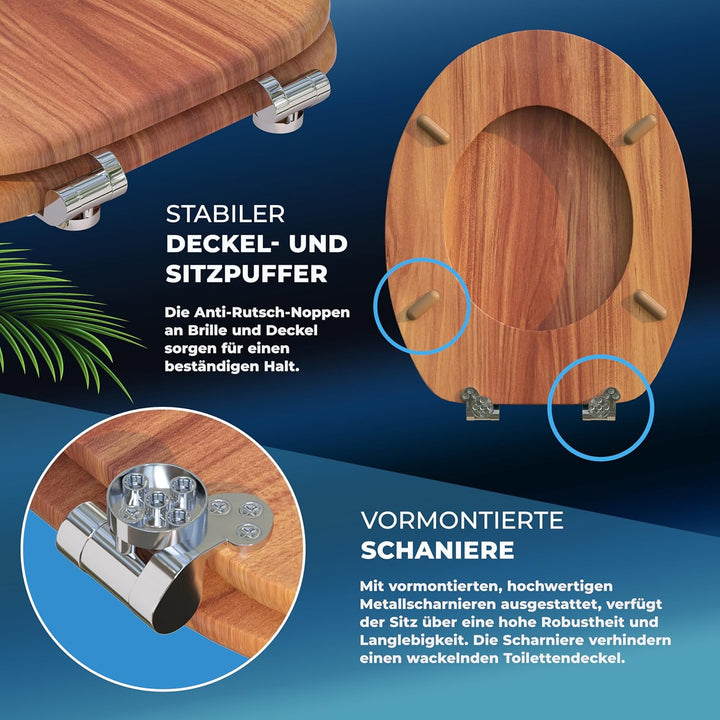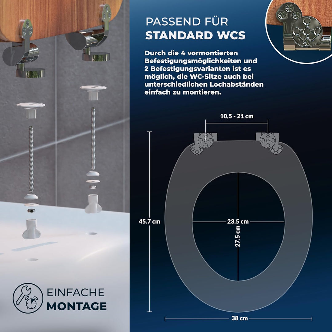 - STABIL: Der Toilettendeckel besteht aus einem stabilen Holzkern. Die rostfreien Metallscharniere sorgen, dank sicherer 3-Punkt-Fixierung, für extra festen Sitz des Deckels. Zudem lässt sich der Scharnierabstand zwischen 10,5 und 21cm verstellen.