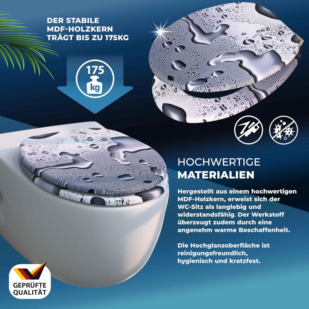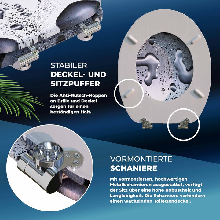 - STABIL: Der Toilettendeckel besteht aus einem stabilen Holzkern. Die rostfreien Metallscharniere sorgen, dank sicherer 3-Punkt-Fixierung, für extra festen Sitz des Deckels. Zudem lässt sich der Scharnierabstand zwischen 10,5 und 21cm verstellen.