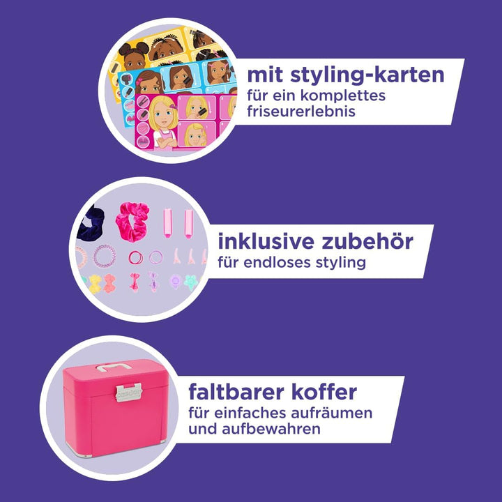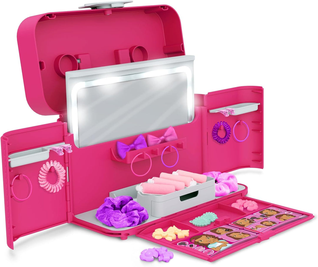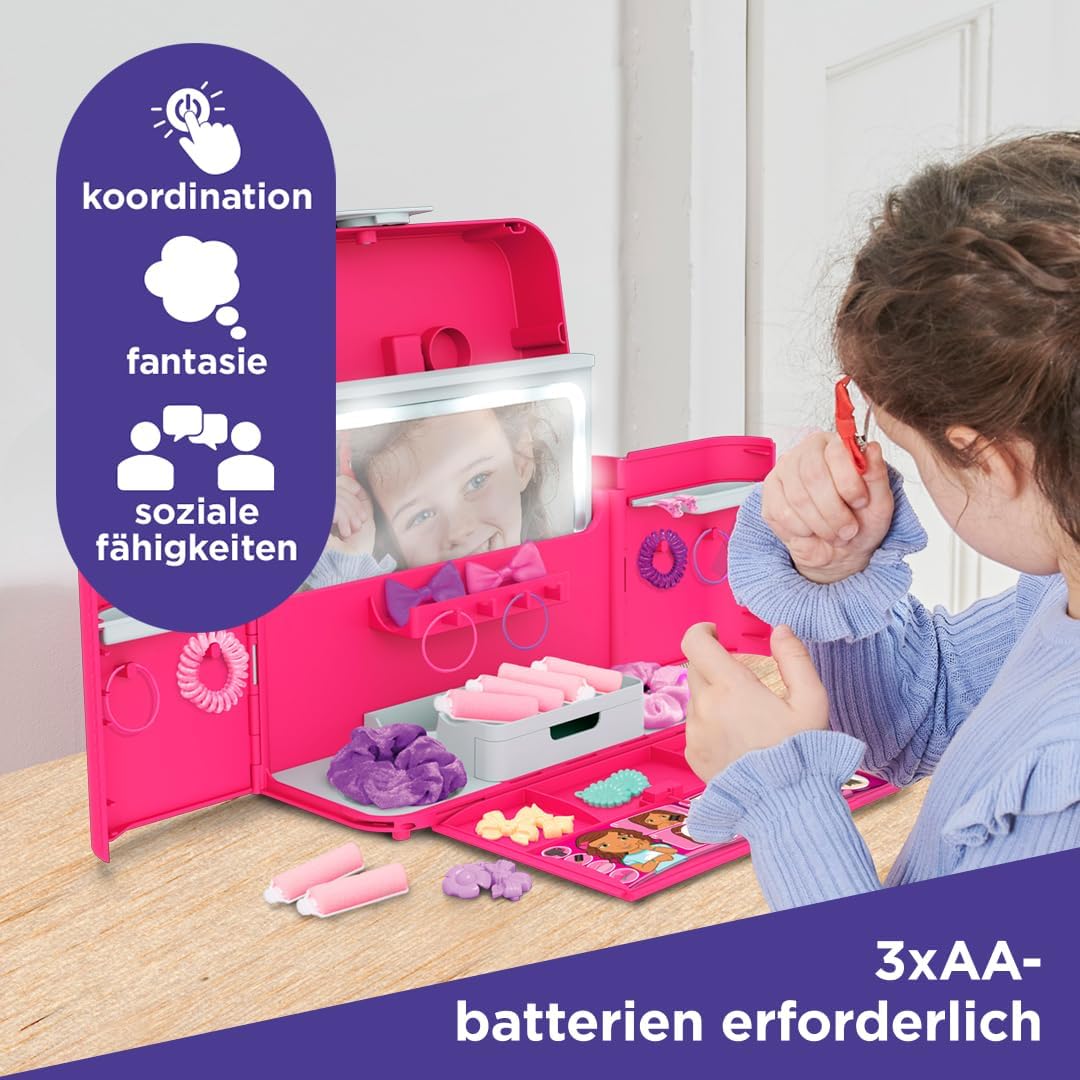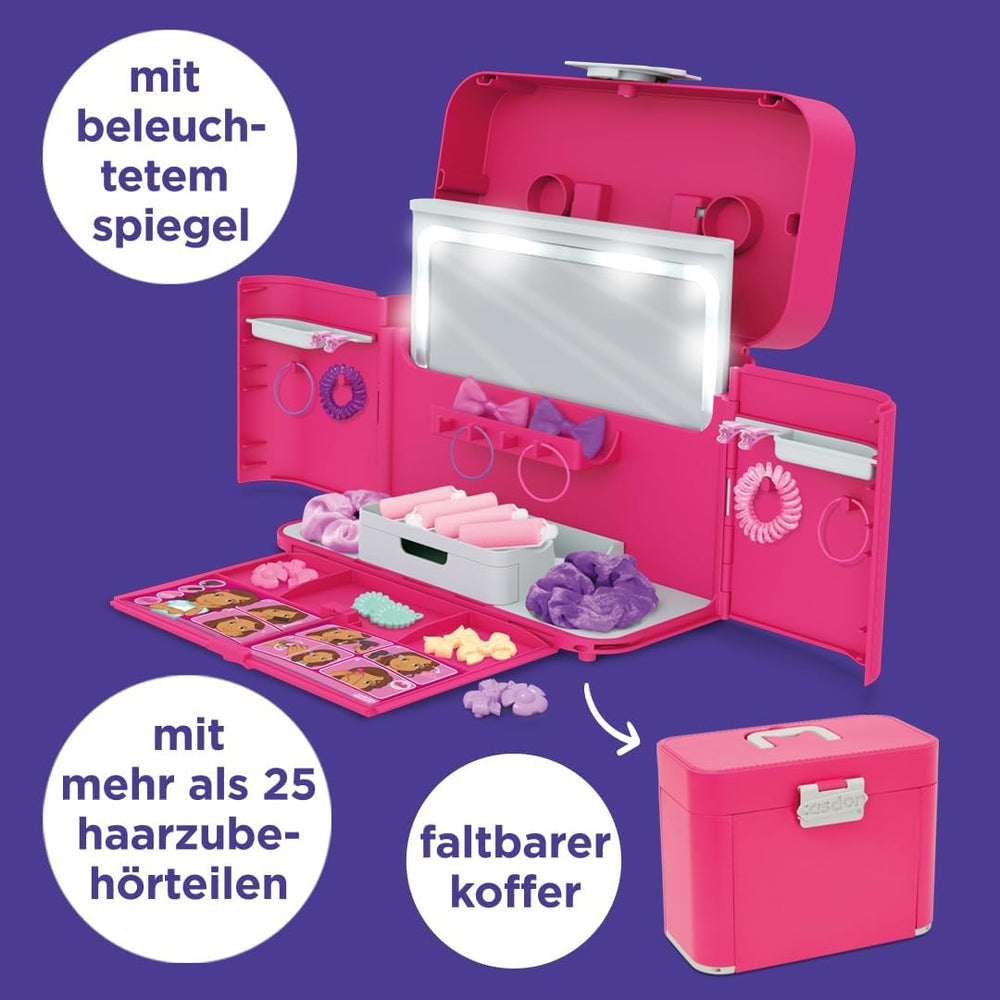 - LIEFERUMFANG: Dieses Spielset enthält einen aufklappbaren Koffer mit einem eingebauten beleuchteten Spiegel, doppelseitige Stylingkarten und mehr als 25 Haar-Accessoires wie Haarspangen, Haargummis, Schleifen und vieles mehr. 3x AAA-Batterien