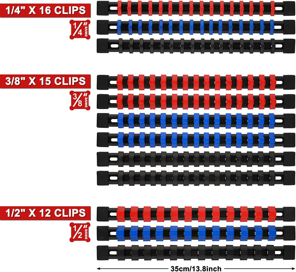 - Holds up to 174 sockets in three color: Blue: 16 x 1/4" Dr. clips, 30x 3/8”Dr. clips, 12 x 1/2" Dr. clips; Red: 16 x 1/4" Dr. clips, 30x 3/8"Dr. clips, 12 x 1/2" Dr. clips; Black: 16 x 1/4" Dr. clips, 30x 3/8"Dr. clips, 12 x 1/2" Dr. clips.