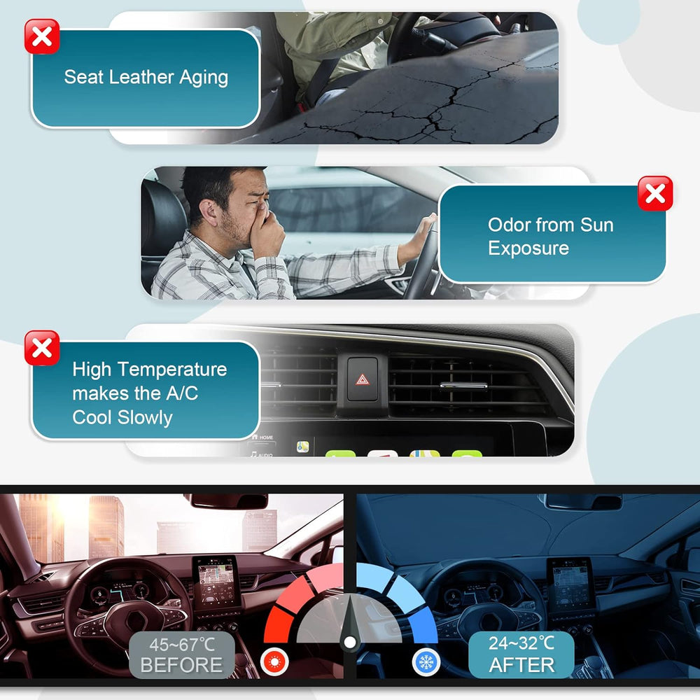 • 【Schützen Sie Ihren Autoinnenraum】Ihr Autoinnenraum wie Armaturenbrett, GPS-Bildschirm, Vordersitze, sie würden beschädigt, leicht zerrissen und einen schlechten Geruch bekommen, wenn Sie den ganzen Tag im heissen Backsommer draussen parken.