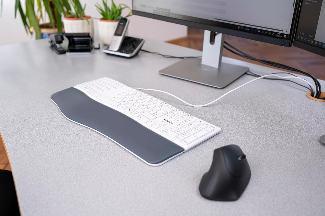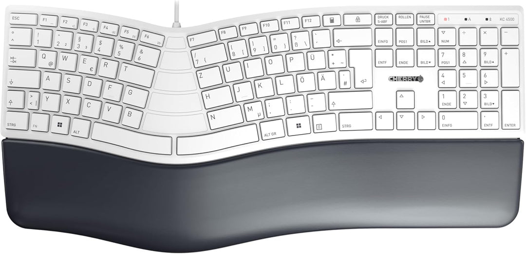 - Ergonomische Kabeltastatur mit geschwungenem Tastenfeld und Handauflage: Für natürlichere Körperhaltung und stressreduziertes Arbeiten am Computer