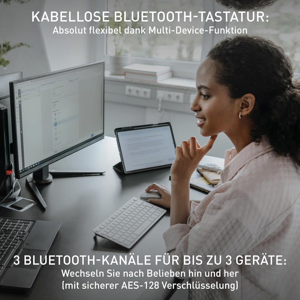 • Kabellose Multi-Device-Tastatur mit 3 Bluetooth-Kanälen: Verbinden Sie bis zu drei Endgeräte auf einmal und wechseln Sie per Tastendruck hin und her - mit sicherer AES-128 Verschlüsselung