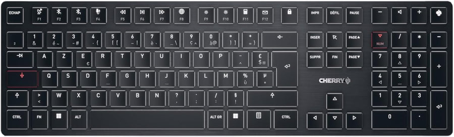 - Geschmackvolle weisse Beleuchtung der Tasten und zusätzliche farbige LEDs für Status- und Sondertasten (+ RGB-LED in der CHERRY Taste für die Anzeige des Ladestands)