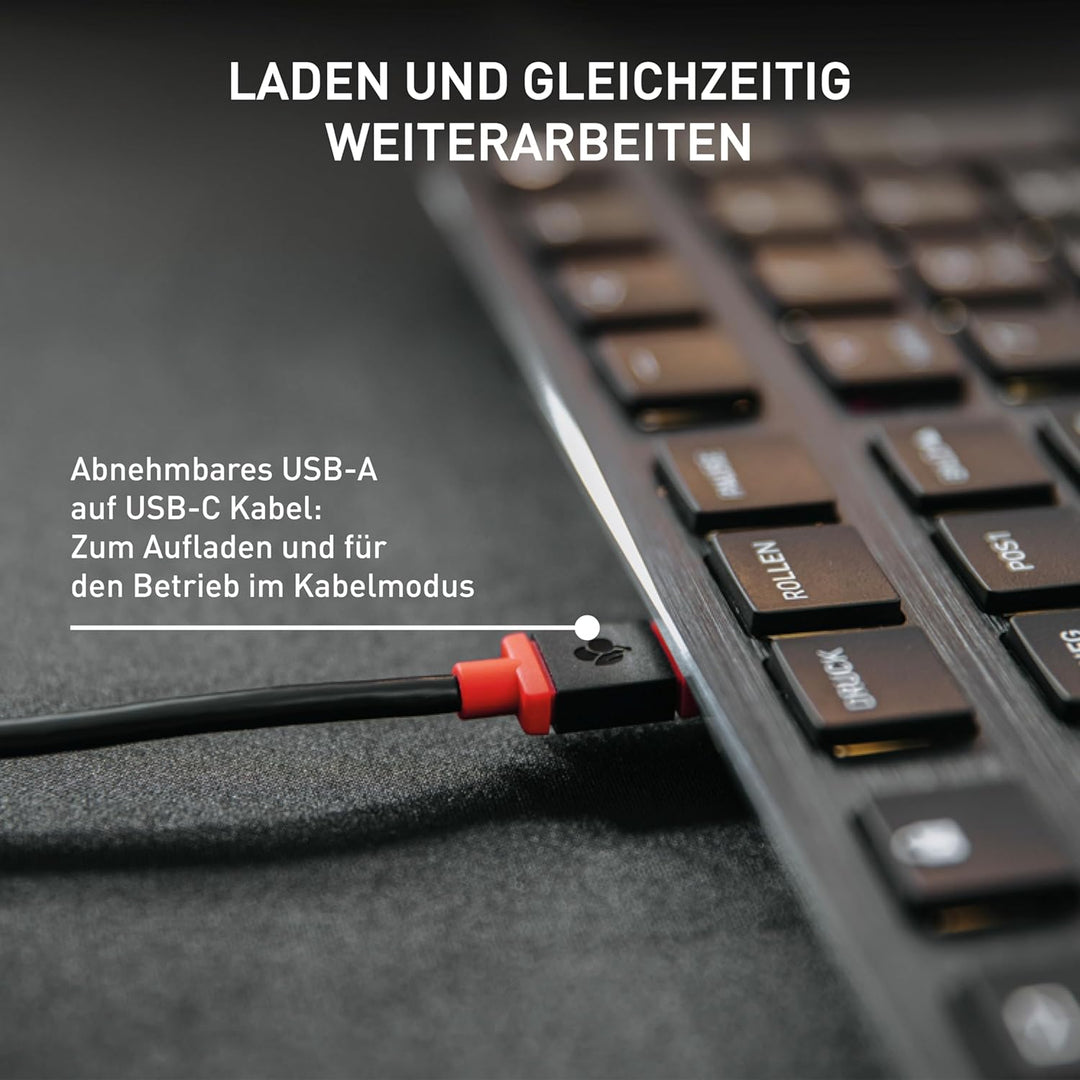 - Wiederaufladbar: Abnehmbares USB-A auf USB-C Kabel zum Aufladen und für den Betrieb im kabelgebundenen Modus (Keyboard ist problemlos auch während des Betriebs aufladbar)