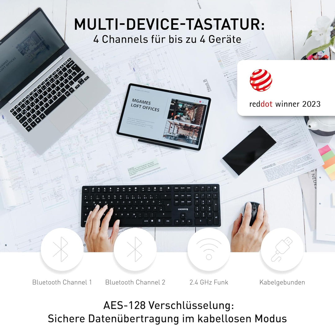 - Multi-Device-Tastatur für bis zu 4 verschiedene Geräte: Zwei Bluetooth 5.2 Channels, ein 2.4 GHz Wireless Channel (jeweils mit sicherer AES-128 Verschlüsselung) und ein Kabelkanal