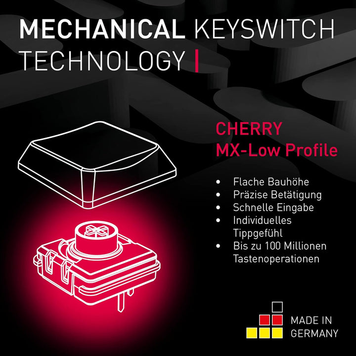 - Hochwertige CHERRY MX LOW PROFILE SPEED Schalter: Schlagfertiges, schnelles und direktes Tippgefühl mit linearer Schaltcharakteristik (ohne Klick) und mehr als 100 Mio. Betätigungen je Taste